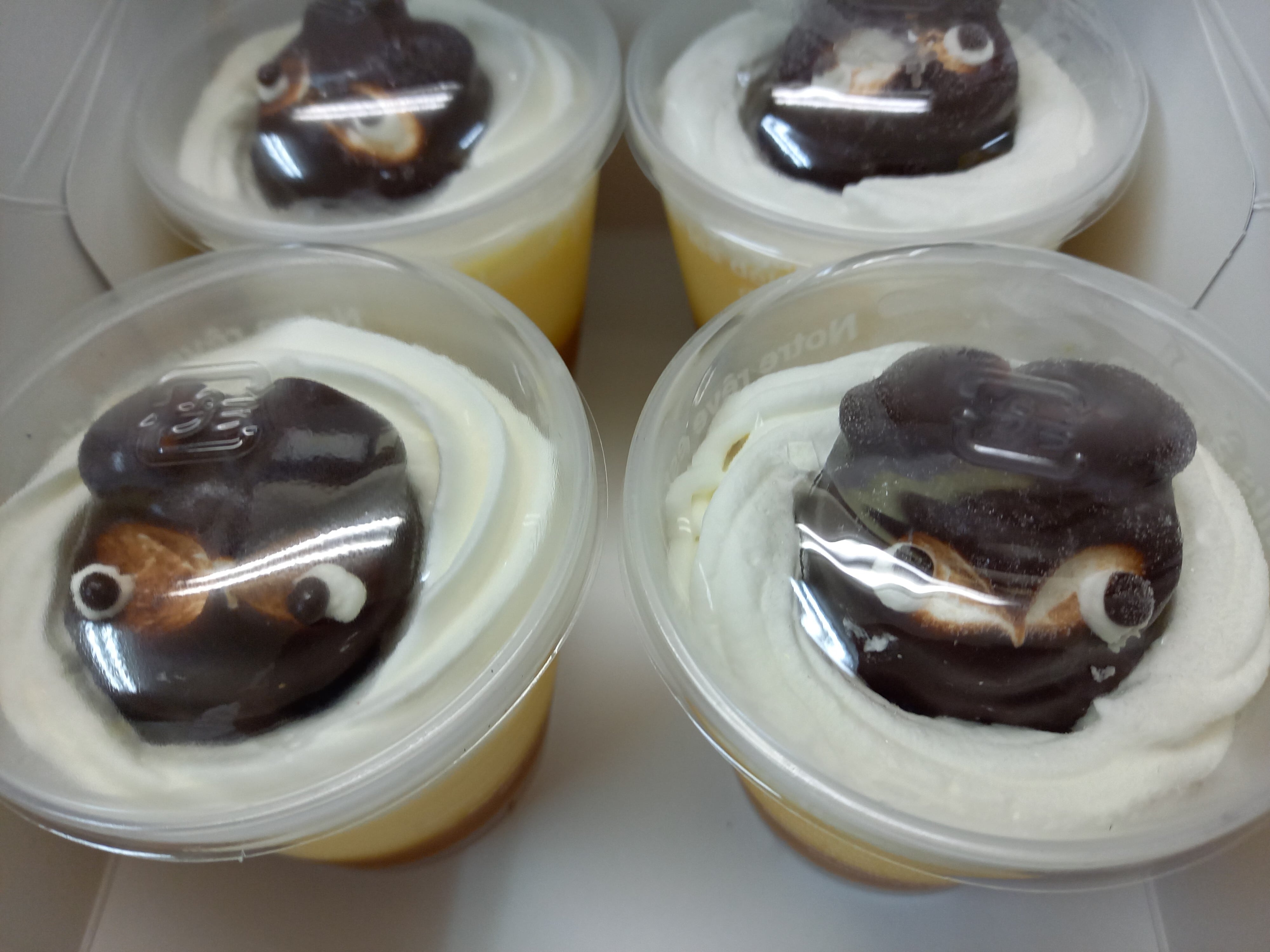 原材料・・・カスタードホイップ(国内製造)、牛乳、砂糖、バター、小麦粉、純チョコレート、(砂糖、食用植物油脂、ココアパウダー、カカオマス、乳糖)、水あめ、寒天、バニラビーンズ、乳化剤、加工デンプン、香料、リン酸塩(NA)、ゲル化剤(増粘多糖類)、着色料(カロテン)、安定剤、(増粘多糖類)、(一部に乳成分、卵、小麦、大豆、ゼラチンを含む)