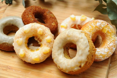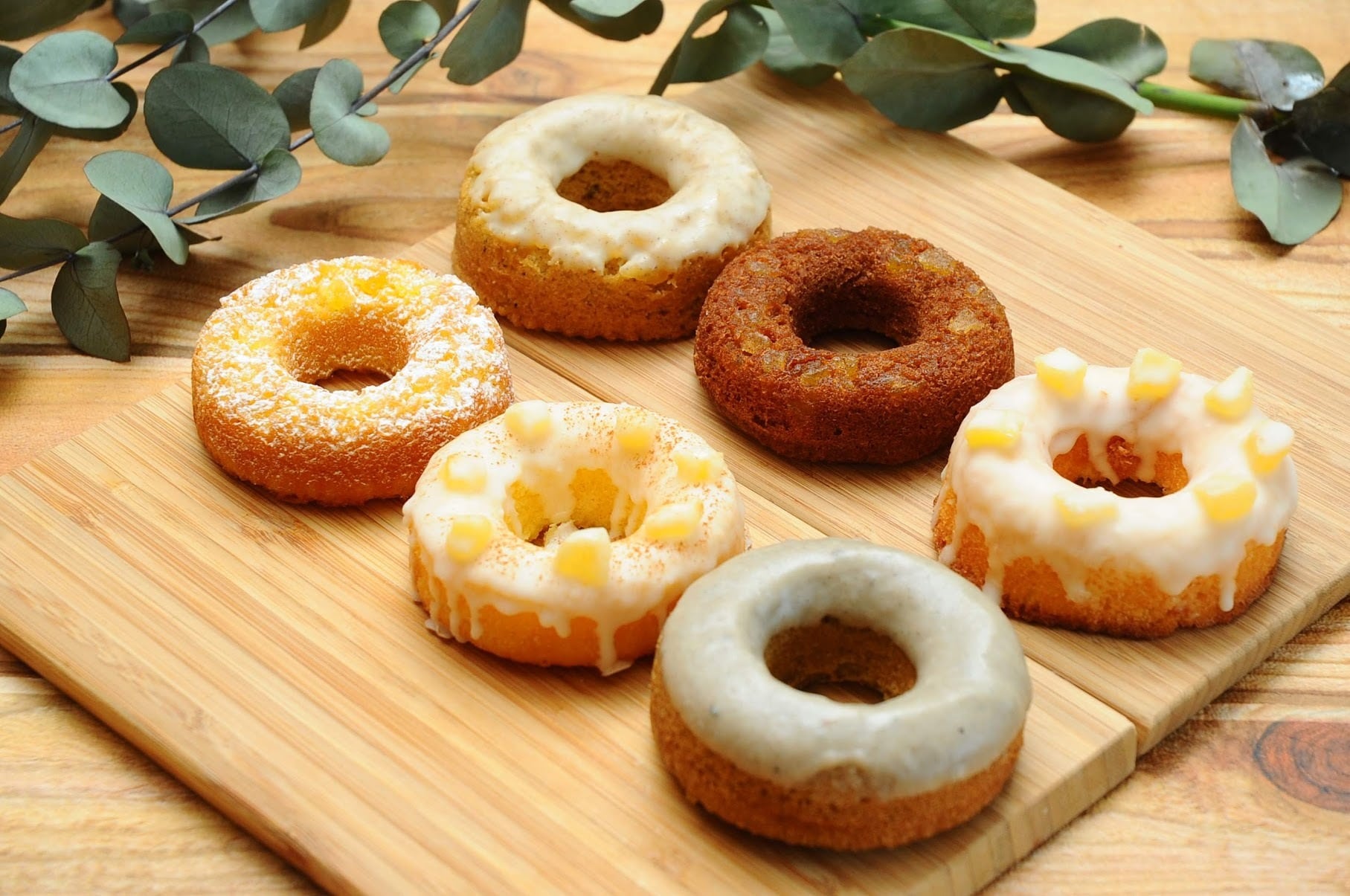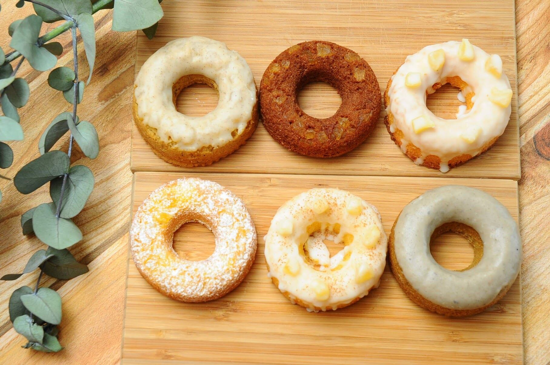 青森県産のジューシーで香り高い品種のふじを蜜づけにした「蜜づけふじりんご」と、相性の良い素材を組み合わせた、バター香る軽い食感の焼きドーナツ6種(りんご、シナモン、ショコラ、紅茶、りんごほうじ茶、キャラメル)です。蜜づけふじりんごの食感がよく、見た目もかわいらしいお菓子です。