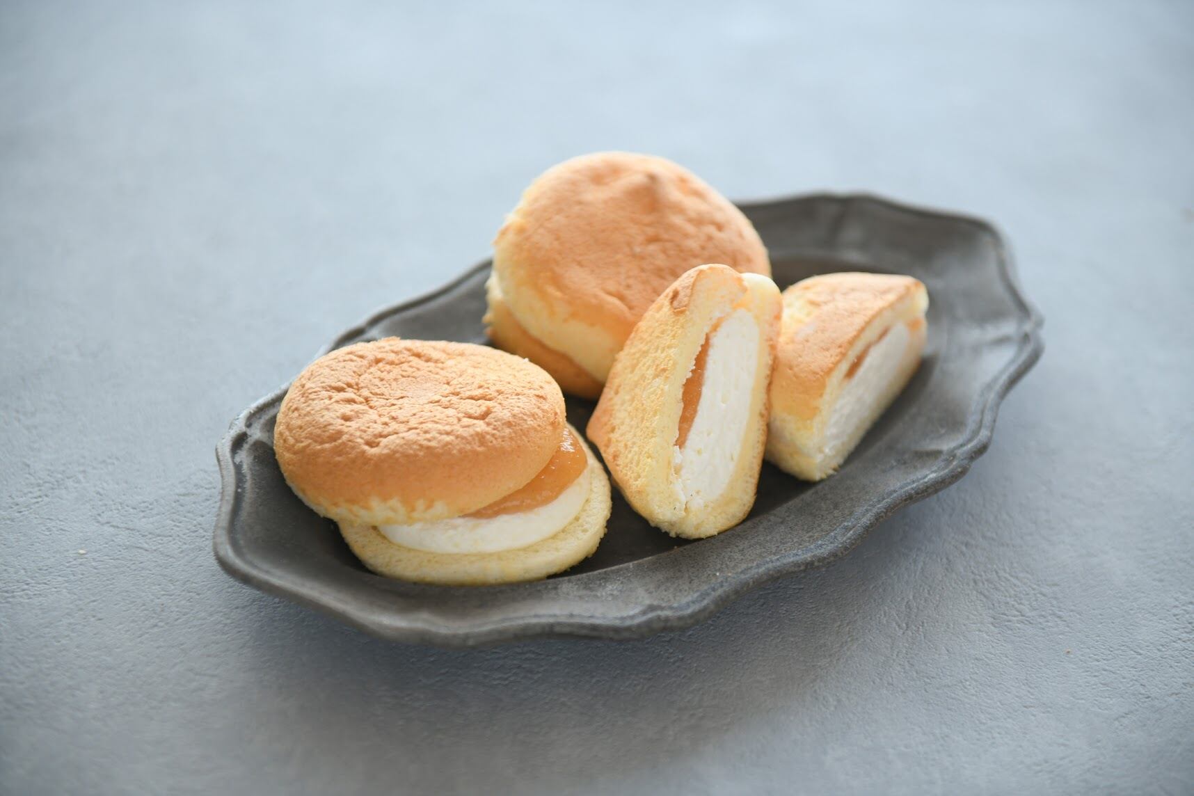 ・チーズサンドりんご・・・しっとり柔らかなスフレチーズスポンジに、なめらかなチーズクリームと、りんごジャムをサンド。※シナモン使用